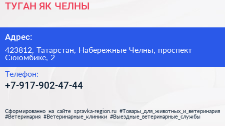 ТУГАН ЯК ЧЕЛНЫ по адресу 423812, Татарстан, Набережные Челны, проспект Сююмбике, 2 в дальнейшем Организация, размещена в следующих категориях: