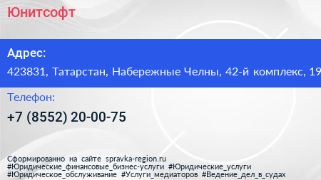 Юнитсофт по адресу 423831, Татарстан, Набережные Челны, 42-й комплекс, 19 в дальнейшем Организация, размещена в следующих категориях: