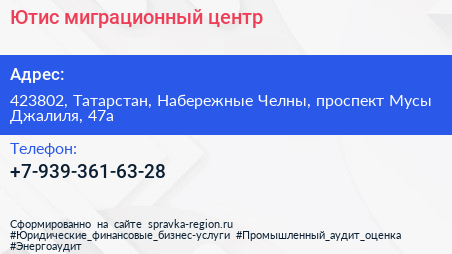 Ютис, миграционный центр по адресу 423802, Татарстан, Набережные Челны, проспект Мусы Джалиля, 47а в дальнейшем Организация, размещена в следующих категориях: