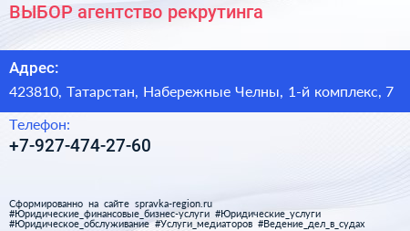 ВЫБОР, агентство рекрутинга по адресу 423810, Татарстан, Набережные Челны, 1-й комплекс, 7 в дальнейшем Организация, размещена в следующих категориях: