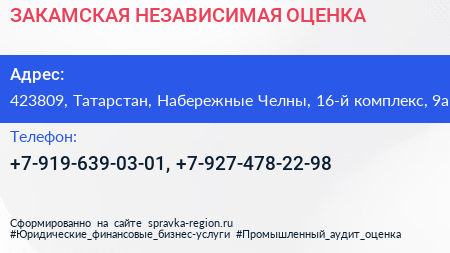 ЗАКАМСКАЯ НЕЗАВИСИМАЯ ОЦЕНКА по адресу 423809, Татарстан, Набережные Челны, 16-й комплекс, 9а в дальнейшем Организация, размещена в следующих категориях: