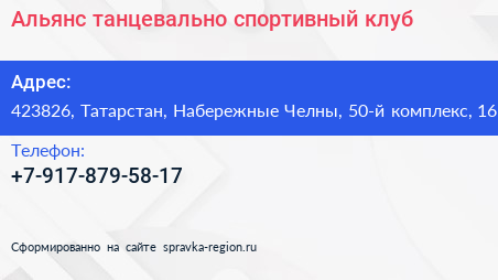 Альянс, танцевально-спортивный клуб по адресу 423826, Татарстан, Набережные Челны, 50-й комплекс, 16 в дальнейшем Организация, размещена в следующих категориях: