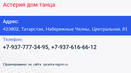 Астерия, дом танца по адресу 423802, Татарстан, Набережные Челны, Центральная, 81 в дальнейшем Организация, размещена в следующих категориях: