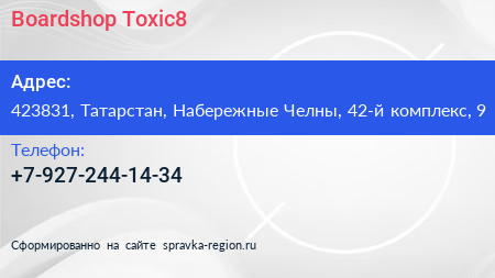 Boardshop Toxic8 по адресу 423831, Татарстан, Набережные Челны, 42-й комплекс, 9 в дальнейшем Организация, размещена в следующих категориях: