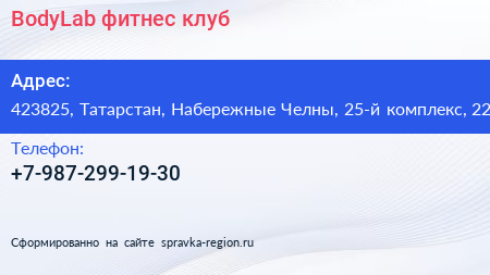 BodyLab, фитнес-клуб по адресу 423825, Татарстан, Набережные Челны, 25-й комплекс, 22 в дальнейшем Организация, размещена в следующих категориях: