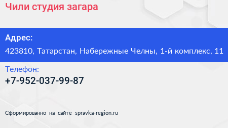 Чили, студия загара по адресу 423810, Татарстан, Набережные Челны, 1-й комплекс, 11 в дальнейшем Организация, размещена в следующих категориях: