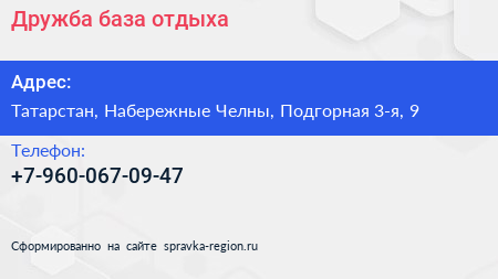 Дружба, база отдыха по адресу Татарстан, Набережные Челны, Подгорная 3-я, 9 в дальнейшем Организация, размещена в следующих категориях: