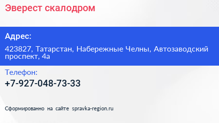 Эверест, скалодром по адресу 423827, Татарстан, Набережные Челны, Автозаводский проспект, 4а в дальнейшем Организация, размещена в следующих категориях: