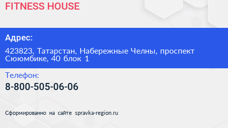 FITNESS HOUSE по адресу 423823, Татарстан, Набережные Челны, проспект Сююмбике, 40 блок 1 в дальнейшем Организация, размещена в следующих категориях: