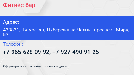 Фитнес-бар по адресу 423821, Татарстан, Набережные Челны, проспект Мира, 89 в дальнейшем Организация, размещена в следующих категориях: