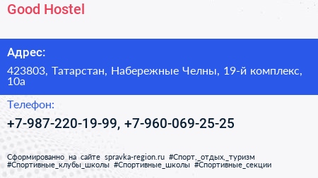 Good Hostel по адресу 423803, Татарстан, Набережные Челны, 19-й комплекс, 10а в дальнейшем Организация, размещена в следующих категориях: