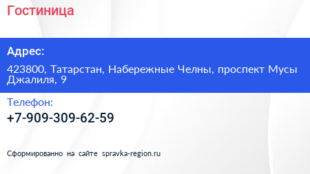 Гостиница по адресу 423800, Татарстан, Набережные Челны, проспект Мусы Джалиля, 9 в дальнейшем Организация, размещена в следующих категориях: