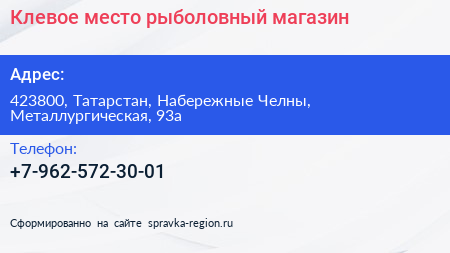 Клевое место, рыболовный магазин по адресу 423800, Татарстан, Набережные Челны, Металлургическая, 93а в дальнейшем Организация, размещена в следующих категориях: