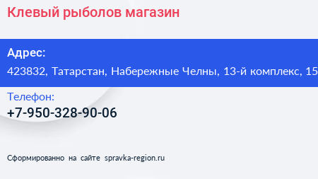 Клевый рыболов, магазин по адресу 423832, Татарстан, Набережные Челны, 13-й комплекс, 15 в дальнейшем Организация, размещена в следующих категориях: