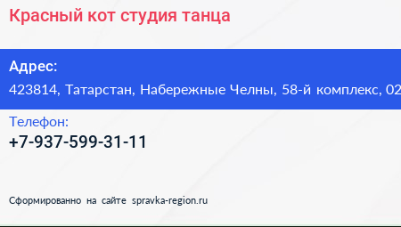 Красный кот, студия танца по адресу 423814, Татарстан, Набережные Челны, 58-й комплекс, 02 в дальнейшем Организация, размещена в следующих категориях: