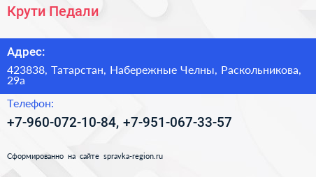 Крути Педали по адресу 423838, Татарстан, Набережные Челны, Раскольникова, 29а в дальнейшем Организация, размещена в следующих категориях: