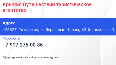 Крылья Путешествий, туристическое агентство по адресу 423827, Татарстан, Набережные Челны, 63-й комплекс, 3 в дальнейшем Организация, размещена в следующих категориях: