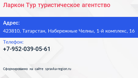 Ларкон-Тур, туристическое агентство по адресу 423810, Татарстан, Набережные Челны, 1-й комплекс, 16 в дальнейшем Организация, размещена в следующих категориях: