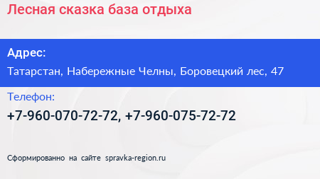 Лесная сказка, база отдыха по адресу Татарстан, Набережные Челны, Боровецкий лес, 47 в дальнейшем Организация, размещена в следующих категориях: