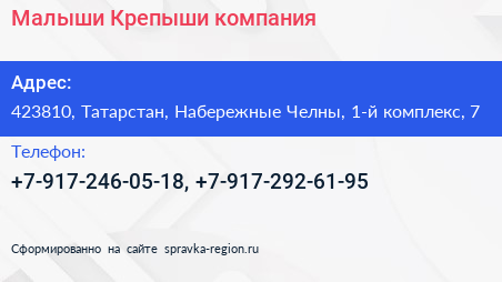 Малыши-Крепыши, компания по адресу 423810, Татарстан, Набережные Челны, 1-й комплекс, 7 в дальнейшем Организация, размещена в следующих категориях: