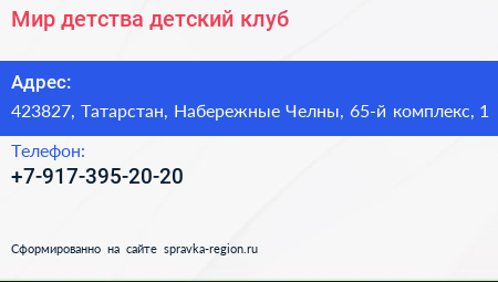 Мир детства, детский клуб по адресу 423827, Татарстан, Набережные Челны, 65-й комплекс, 1 в дальнейшем Организация, размещена в следующих категориях: