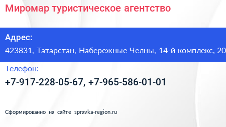 Миромар, туристическое агентство по адресу 423831, Татарстан, Набережные Челны, 14-й комплекс, 20 в дальнейшем Организация, размещена в следующих категориях: