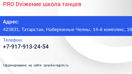 PRO.Dviжение, школа танцев по адресу 423831, Татарстан, Набережные Челны, 14-й комплекс, 18 в дальнейшем Организация, размещена в следующих категориях: