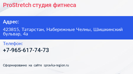 ProStretch, студия фитнеса по адресу 423815, Татарстан, Набережные Челны, Шишкинский бульвар, 4а в дальнейшем Организация, размещена в следующих категориях:
