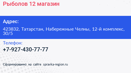 Рыболов 12, магазин по адресу 423832, Татарстан, Набережные Челны, 12-й комплекс, 30/5 в дальнейшем Организация, размещена в следующих категориях: