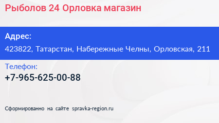 Рыболов 24 Орловка, магазин по адресу 423822, Татарстан, Набережные Челны, Орловская, 211 в дальнейшем Организация, размещена в следующих категориях: