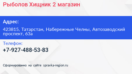 Рыболов Хищник 2, магазин по адресу 423815, Татарстан, Набережные Челны, Автозаводский проспект, 63а в дальнейшем Организация, размещена в следующих категориях: