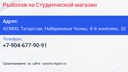 Рыболов на Студенческой, магазин по адресу 423800, Татарстан, Набережные Челны, 8-й комплекс, 32 в дальнейшем Организация, размещена в следующих категориях: