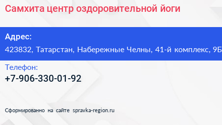 Самхита, центр оздоровительной йоги по адресу 423832, Татарстан, Набережные Челны, 41-й комплекс, 9Б в дальнейшем Организация, размещена в следующих категориях: