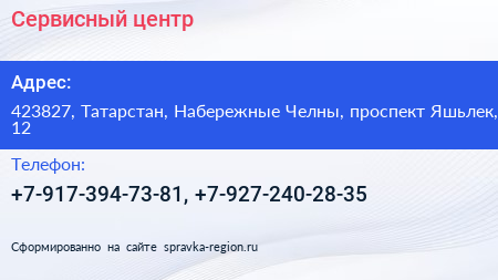 Сервисный центр по адресу 423827, Татарстан, Набережные Челны, проспект Яшьлек, 12 в дальнейшем Организация, размещена в следующих категориях: