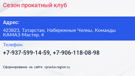 Сезон, прокатный клуб по адресу 423823, Татарстан, Набережные Челны, Команды КАМАЗ-Мастер, 4 в дальнейшем Организация, размещена в следующих категориях: