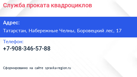 Служба проката квадроциклов по адресу Татарстан, Набережные Челны, Боровецкий лес, 17 в дальнейшем Организация, размещена в следующих категориях: