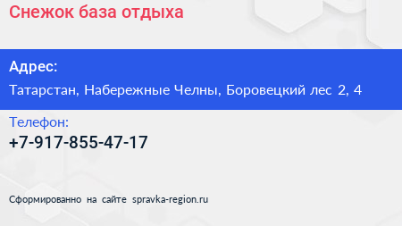 Снежок, база отдыха по адресу Татарстан, Набережные Челны, Боровецкий лес 2, 4 в дальнейшем Организация, размещена в следующих категориях: