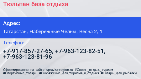 Тюльпан, база отдыха по адресу Татарстан, Набережные Челны, Весна 2, 1 в дальнейшем Организация, размещена в следующих категориях: