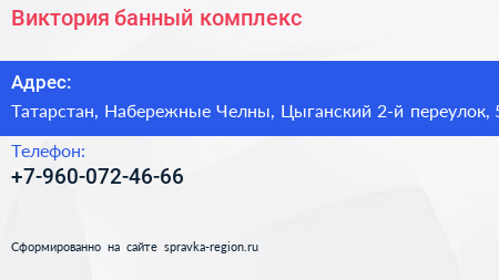 Виктория, банный комплекс по адресу Татарстан, Набережные Челны, Цыганский 2-й переулок, 5 в дальнейшем Организация, размещена в следующих категориях:
