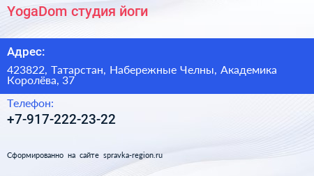 YogaDom, студия йоги по адресу 423822, Татарстан, Набережные Челны, Академика Королёва, 37 в дальнейшем Организация, размещена в следующих категориях: