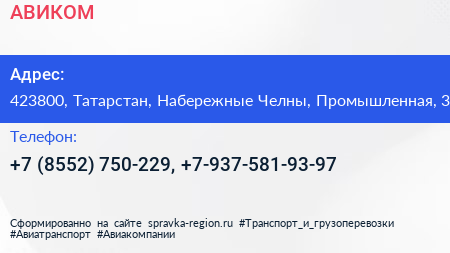 АВИКОМ по адресу 423800, Татарстан, Набережные Челны, Промышленная, 3 в дальнейшем Организация, размещена в следующих категориях: