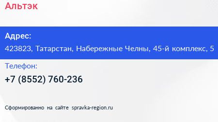 Альтэк по адресу 423823, Татарстан, Набережные Челны, 45-й комплекс, 5 в дальнейшем Организация, размещена в следующих категориях:
