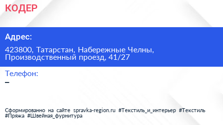 КОДЕР по адресу 423800, Татарстан, Набережные Челны, Производственный проезд, 41/27 в дальнейшем Организация, размещена в следующих категориях: