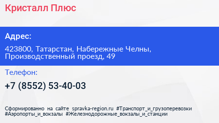 Кристалл-Плюс по адресу 423800, Татарстан, Набережные Челны, Производственный проезд, 49 в дальнейшем Организация, размещена в следующих категориях: