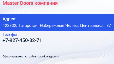 Master Doors, компания по адресу 423802, Татарстан, Набережные Челны, Центральная, 87 в дальнейшем Организация, размещена в следующих категориях: