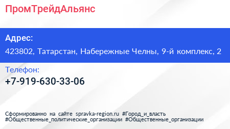 ПромТрейдАльянс по адресу 423802, Татарстан, Набережные Челны, 9-й комплекс, 2 в дальнейшем Организация, размещена в следующих категориях: