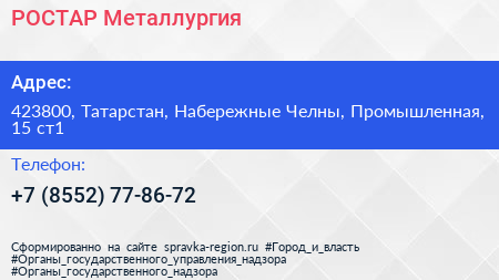 РОСТАР-Металлургия по адресу 423800, Татарстан, Набережные Челны, Промышленная, 15 ст1 в дальнейшем Организация, размещена в следующих категориях: