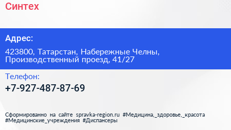 Синтех по адресу 423800, Татарстан, Набережные Челны, Производственный проезд, 41/27 в дальнейшем Организация, размещена в следующих категориях: