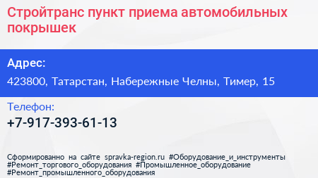 Стройтранс, пункт приема автомобильных покрышек по адресу 423800, Татарстан, Набережные Челны, Тимер, 15 в дальнейшем Организация, размещена в следующих категориях: