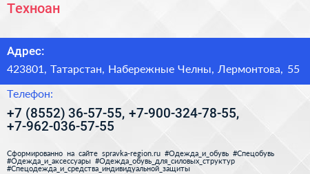 Техноан по адресу 423801, Татарстан, Набережные Челны, Лермонтова, 55 в дальнейшем Организация, размещена в следующих категориях: